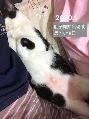 今年5月中的肚肚毛,因為長期戴頭套舔不到的狀況下慢慢長回來,但是皮膚因為反覆舔毛刺激,導致變得脆弱。